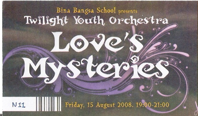 Pada tanggal 15 Agustus 2008, jam 19:00 sampai 21:00. Sekolah saya (Bina Bangsa School) mengadakan acara orchestra, bernama Twilight Youth Orchestra. Acara itu diselenggarakan di lantai 7 ruang assembly. Sekolah Bina Bangsa mengundang orang dari luar (bukan dari dalam sekolah) untuk memainkan alat musik. Terdapat 550 tempat duduk yang tersedia disana. Terdapat 40% Tempat duduk busa, dan 60% tempat duduk plastik.