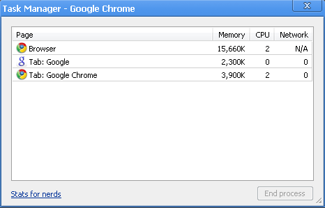 Dengan Google Chrome task manager, kita dapat mengetahui bagaimana sebuah website menggunakan memori, cpu, dan data transfer anda.
