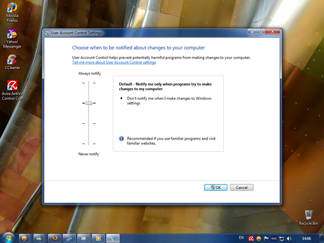 Anda dapat memilih jika peringatan UAC hanya ditampilkan jika program asing dijalankan di komputer anda atau dengan sistem lama (UAC ditampilkan juga jika merubah settings)