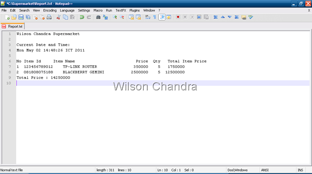 This program is used to help people administering supermarkets which consists of many items and stocks to track, and is required to print purchase receipt.