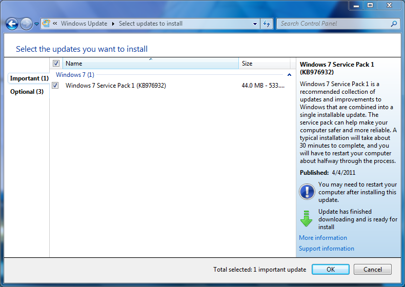 - Melalui windows update. Anda bisa membuka windows update, dan melakukan instalasi Windows 7 Service Pack 1 (KB976932). Jika update dijalankan secara otomatis, maka update ini akan diinstalasikan secara otomatis.