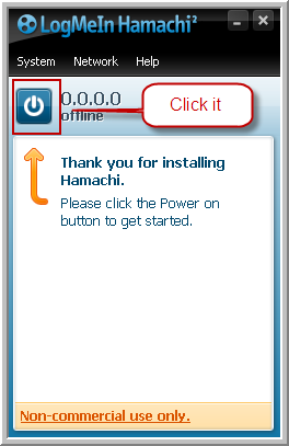 2. Jalankan Hamachi, layar berikut akan ditampilkan. Klik Power on. Assign nama jika perlu. ![]()