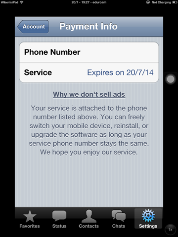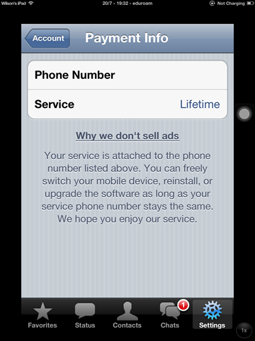 Sayangnya, whatsapp lifetime service tidak bisa didapatkan lagi jika anda telah mendaftarkan whatsapp di device lain, dan memindahkan ke device iOS yang diinstall whatsapp versi 2.8.7. Status service dapat ditampilkan setelah meng-upgrade whatsapp ke versi 2.10.1.
