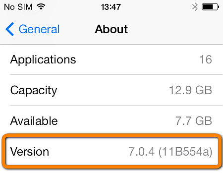 1. Cek bahwa versi firmware merupakan versi iOS 7.0 – 7.0.4. Buka settings > general > about.